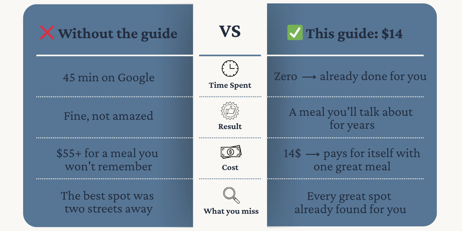 No refunds on digital products. But honestly, at $14, one bad restaurant decision costs you more than this entire guide. And I'd rather you never make that bad decision.